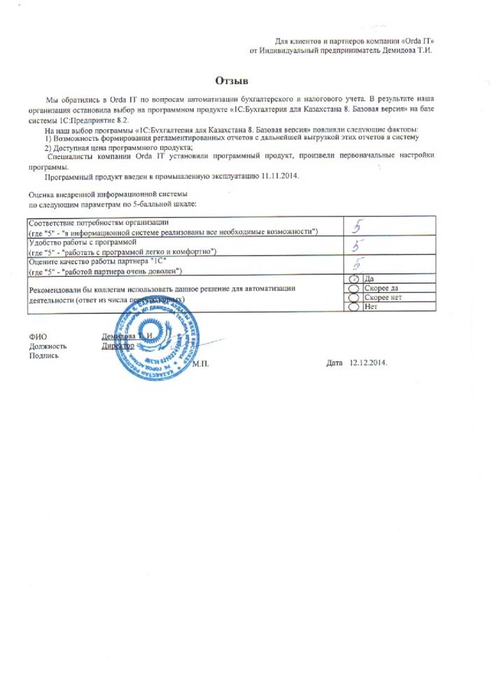 Внедренное решение: ИП Демидова Т.И. автоматизировал бухгалтерский и налоговый учёт на базе ПП "1С:Бухгалтерия 8 для Казахстана. Базовая версия "