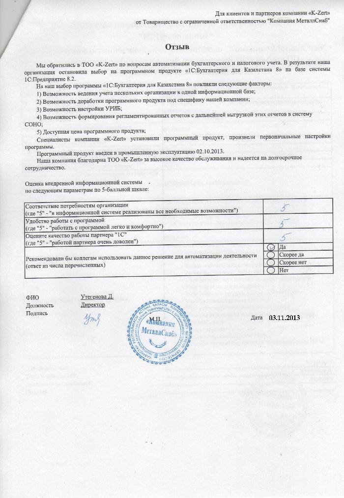 Внедренное решение: ТОО «Компания МеталлСнаб» автоматизировал бухгалтерский и налоговый учёт на базе ПП "1С:Бухгалтерия 8 для Казахстана"