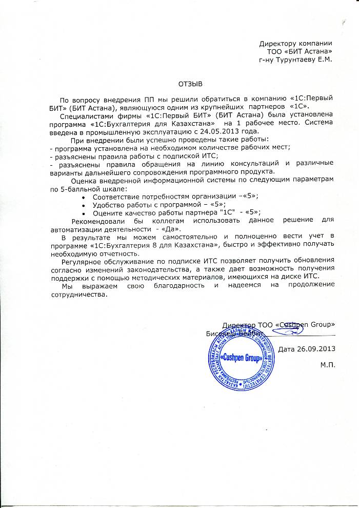 Внедренное решение: Автоматизация бухгалтерского учета в ТОО "Cushpen Group" на базе программного продукта "1С:Предприятие 8.Бухгалтерия для Казахстана"