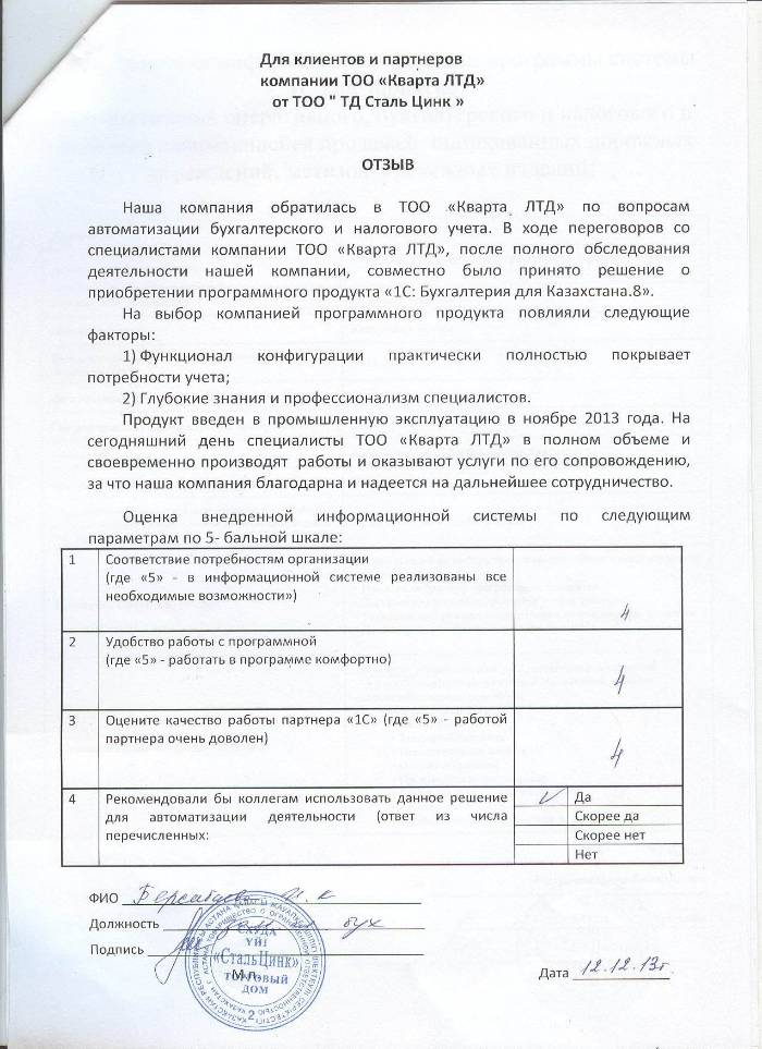 Отзыв клиента на внедренное решение