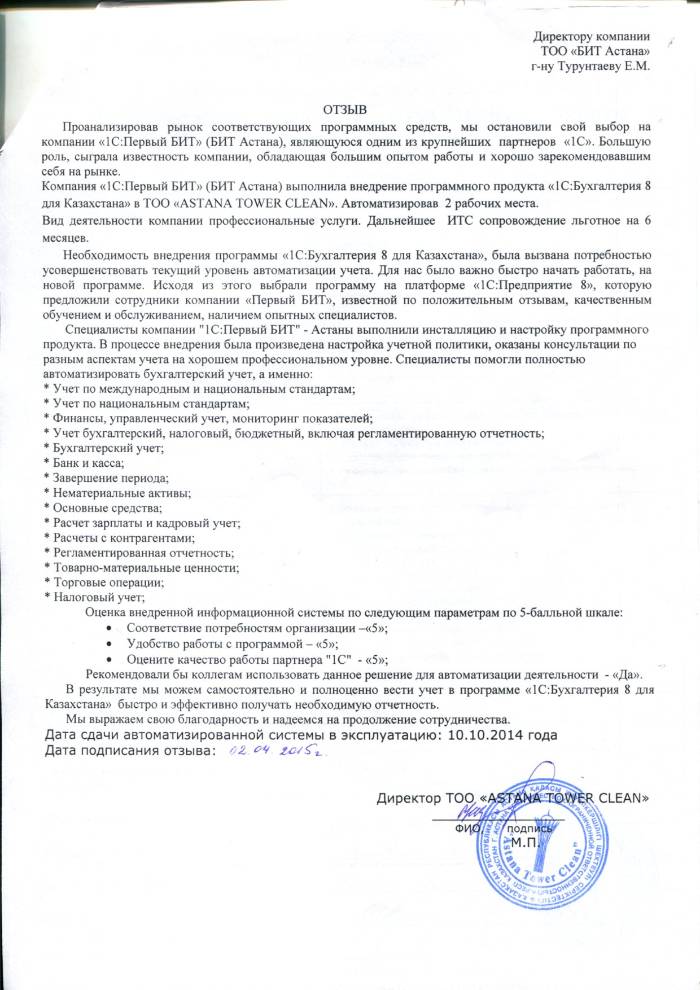 Внедренное решение: Автоматизация бухгалтерского учета в ТОО "ASTANA TOWER CLEAN" на базе программного продукта "1С:Бухгалтерия 8 для Казахстана"