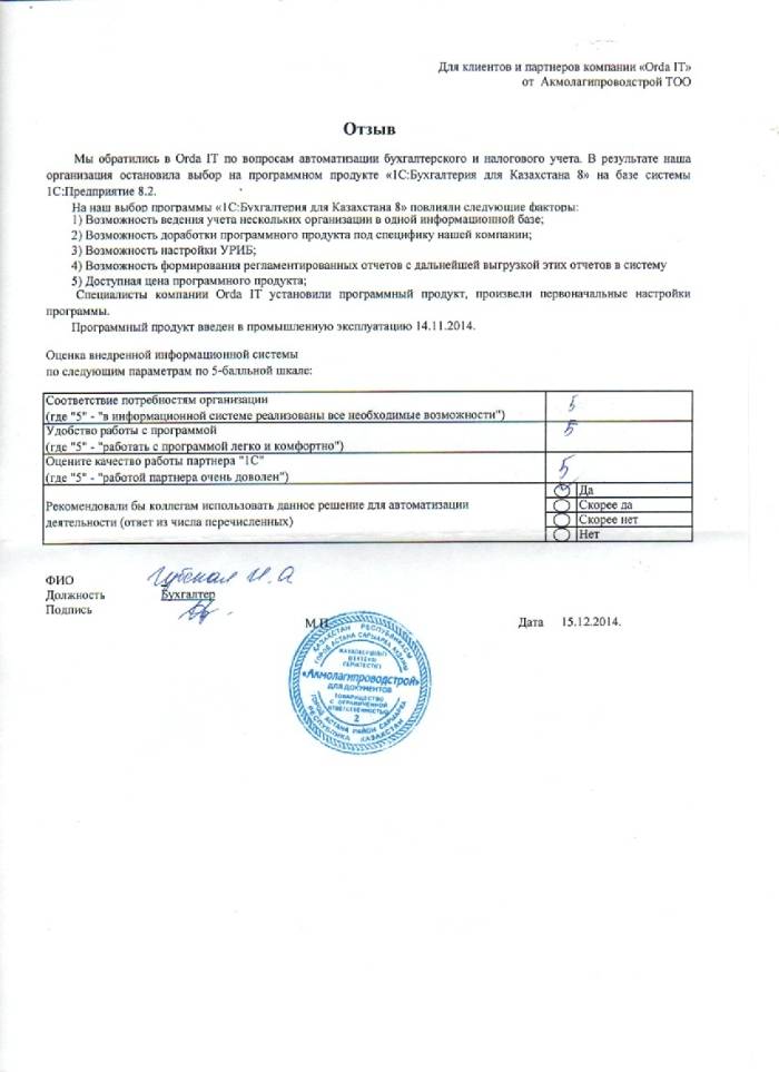 Внедренное решение: ТОО "Акмолагипроводстрой" автоматизировал бухгалтерский и налоговый учёт на базе ПП "1С:Предприятие 8 Бухгалтерия для Казахстана"