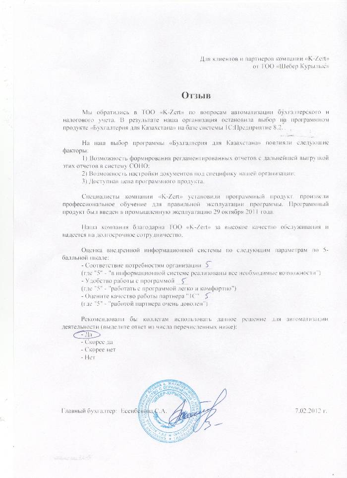 Внедренное решение: Автоматизация бухгалтерского и налогового учёта в ТОО «Шебер Курылыс» на базе ПП "1С:Бухгалтерия 8 для Казахстана"