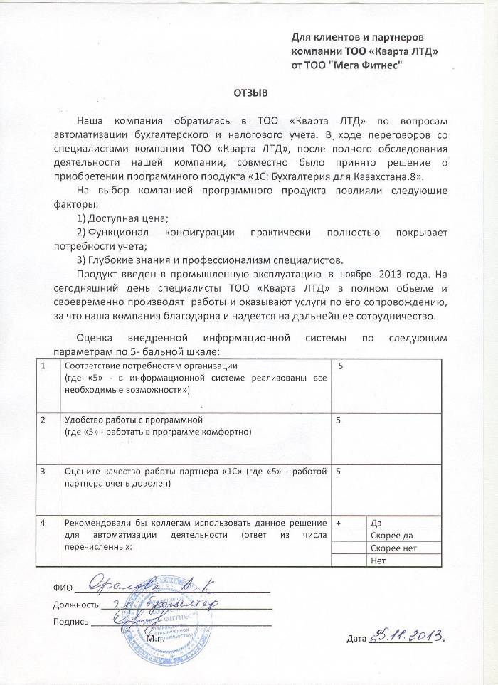Отзыв клиента на внедренное решение