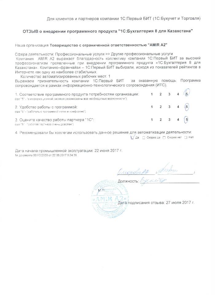 Внедренное решение: Автоматизация бухгалтерского учета на базе программного продукта "1С:Бухгалтерия 8 для Казахстана" в ТОО "AMIR A2"