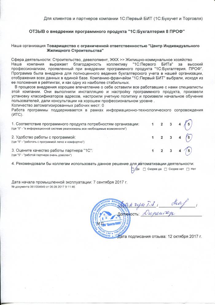 Внедренное решение: Автоматизация бухгалтерского учета на базе программного продукта "1С:Бухгалтерия 8 для Казахстана" в ТОО "Центр Индивидуального Жилищного Строительства"