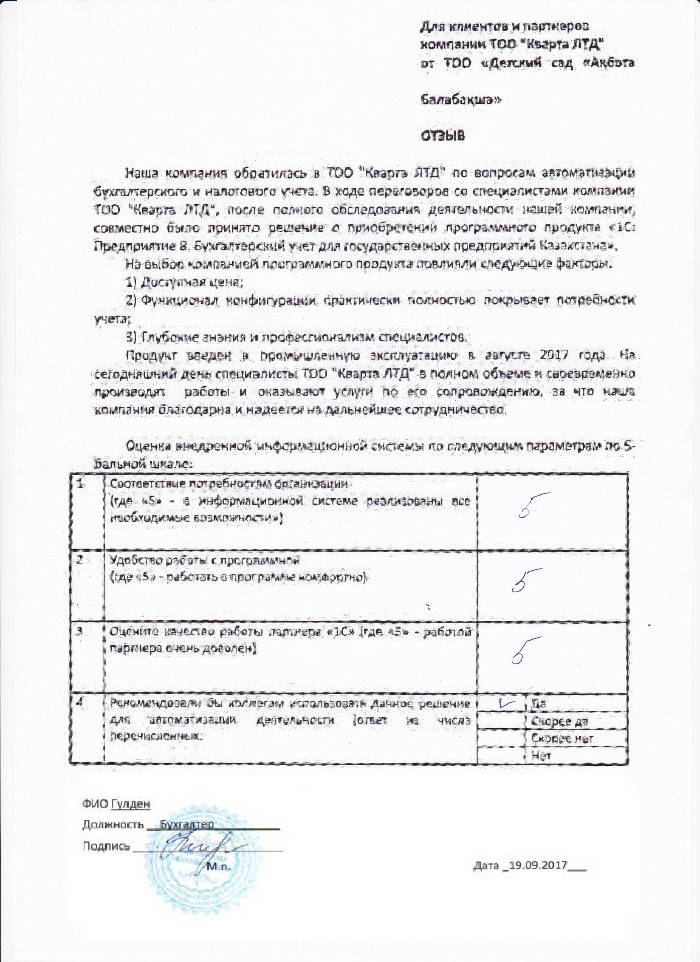 Отзыв клиента на внедренное решение
