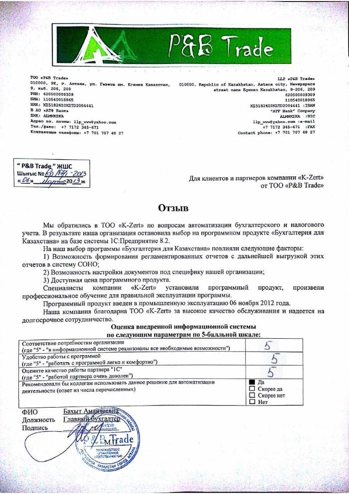 Внедренное решение: ТОО «P&B Trade» автоматизировал бухгалтерский и налоговый учёт на базе ПП "1С:Бухгалтерия 8 для Казахстана"