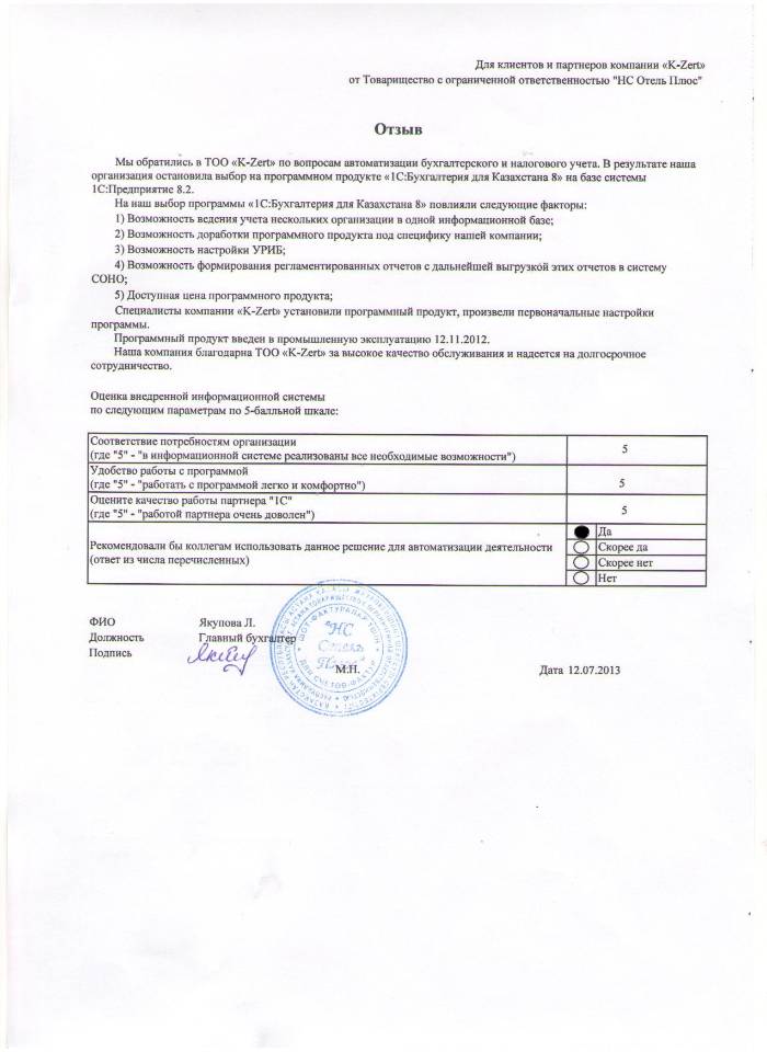 Внедренное решение: ТОО «НС Отель Плюс» автоматизировал бухгалтерский и налоговый учёт на базе ПП "1С:Бухгалтерия 8 для Казахстана"