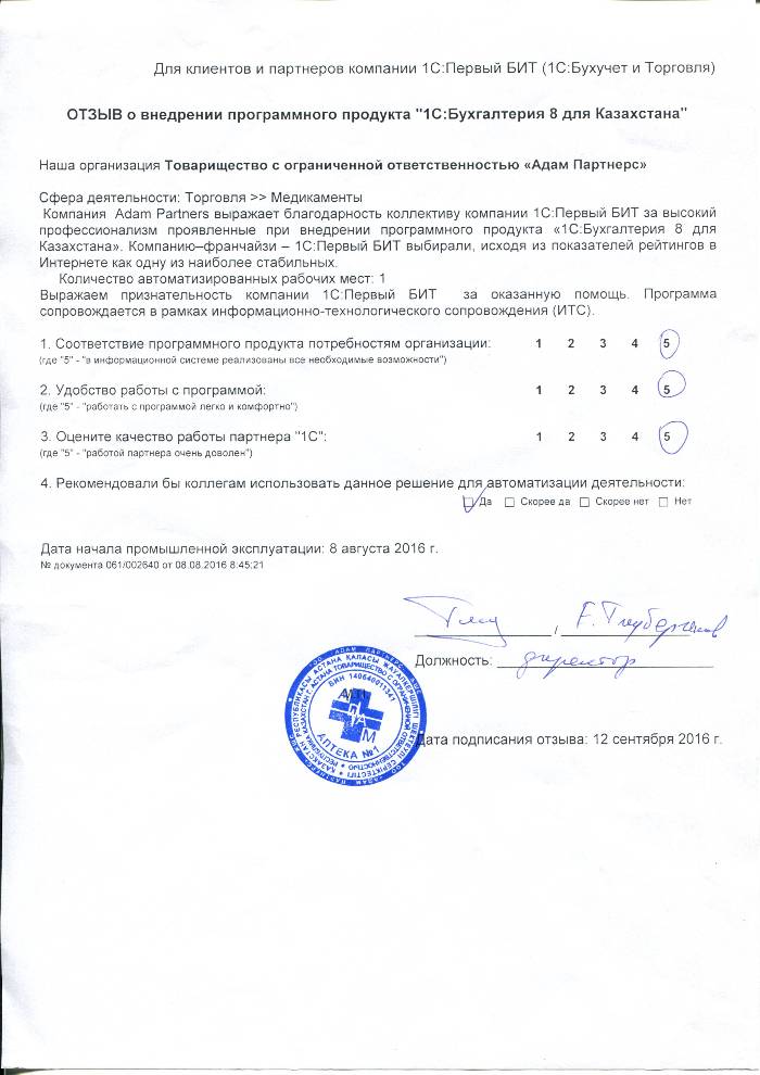 Оценка качества работы партнера "1С": 5