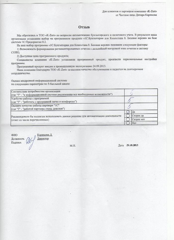 Внедренное решение: ЧЛ Каримова Динара автоматизировал бухгалтерский и налоговый учёт на базе ПП "1С:Бухгалтерия 8 для Казахстана. Базовая версия"