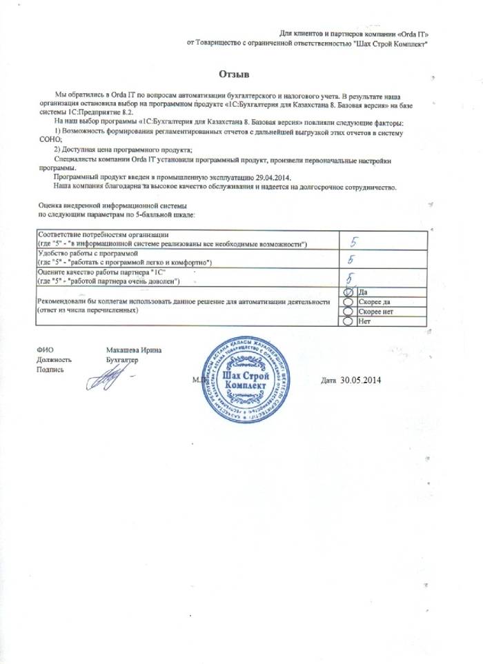 Внедренное решение: ТОО "Шах Строй Комплект" автоматизировал бухгалтерский и налоговый учёт на базе ПП "1С:Бухгалтерия 8 для Казахстана. Базовая версия"