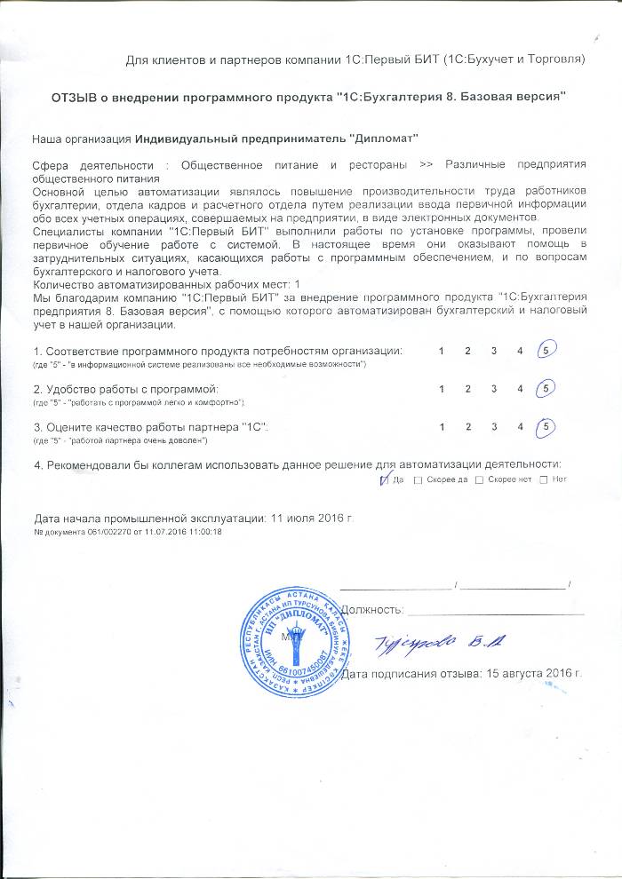 Внедренное решение: Автоматизация бухгалтерского учета на базе программного продукта "1С:Бухгалтерия 8 для Казахстана. Базовая версия" у ИП "Дипломат"