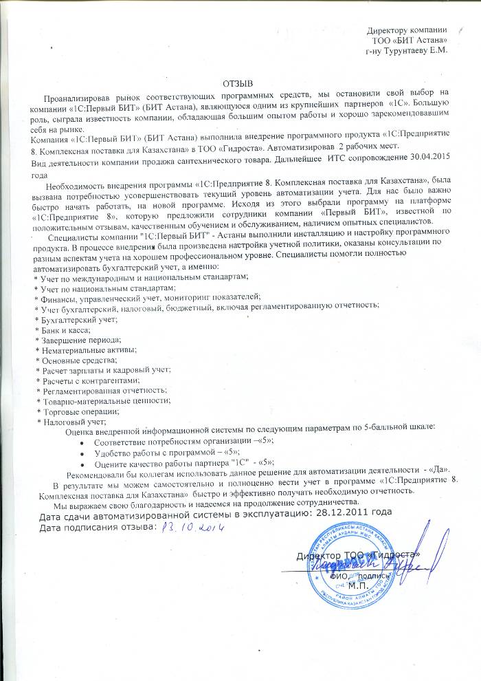 Внедренное решение: Автоматизация оперативного, управленческого, бухгалтерского и налогового учета в ТОО "Гидроста" на базе программного продукта "1С:Предприятие 8. Комплексная поставка для Казахстана"
