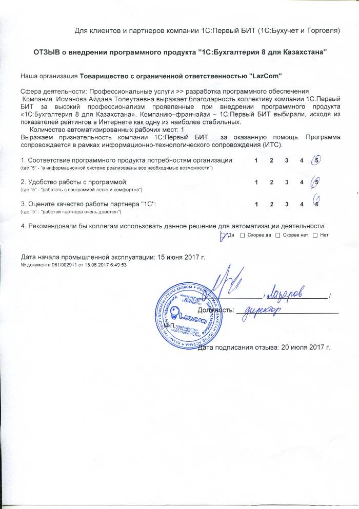 Внедренное решение: Автоматизация бухгалтерского учета на базе программного продукта "1С:Бухгалтерия 8 для Казахстана" в ТОО "LazCom"