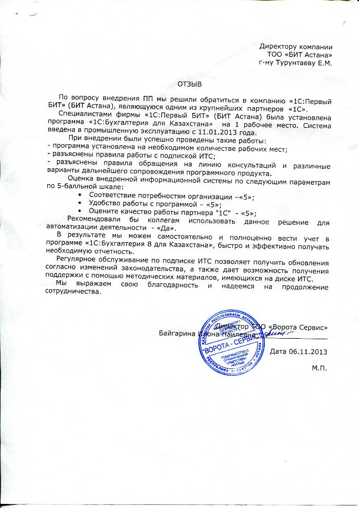 Внедренное решение: Автоматизация бухгалтерского учета в ТОО "Ворота Сервис" на базе программного продукта "1С:Бухгалтерия 8 для Казахстана"